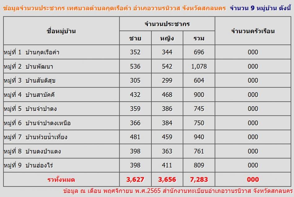 ข้อมูลจำนวนประชากร เทศบาลตำบลกุดเรือคำ อำเภอวานรนิวาส จังหวัดสกลนคร จำนวน 9 หมู่บ้าน ดังนี้