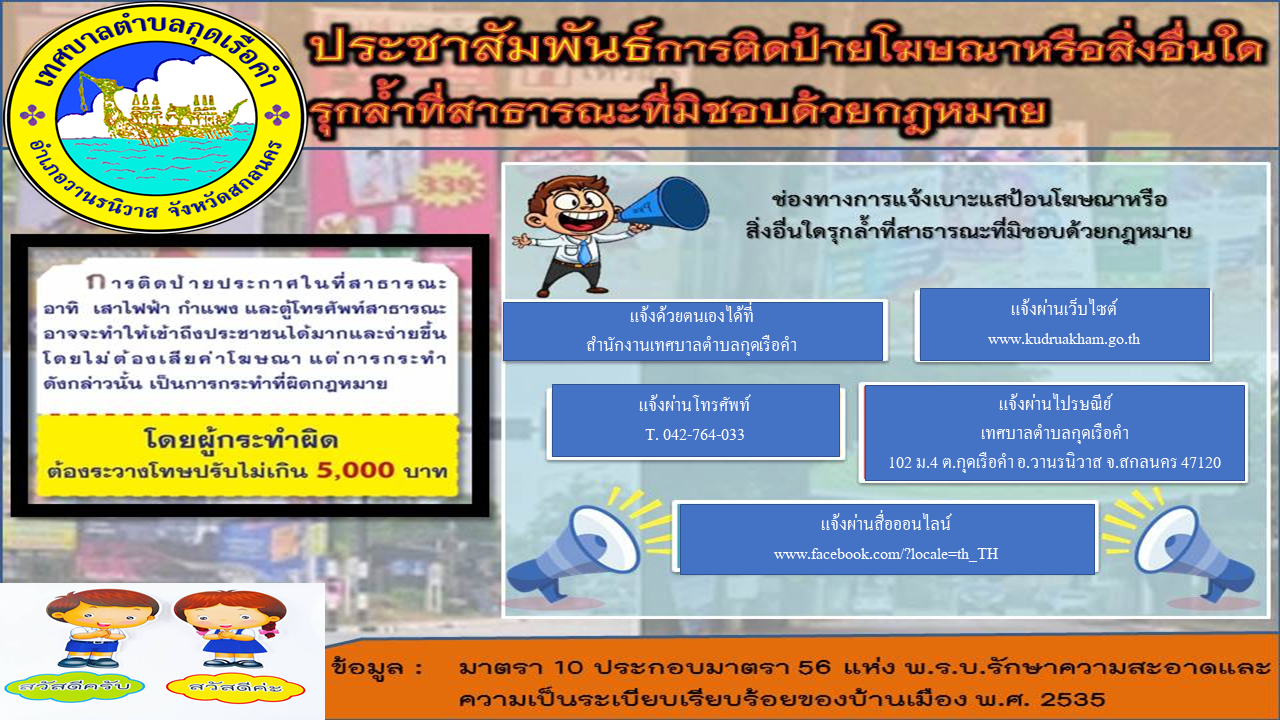 ประชาสัมพันธ์ การติดป้ายโฆษณาหรือสิ่งอื่นใด รุกล้ำที่สาธารณะที่มิชอบด้วยกฎหมาย