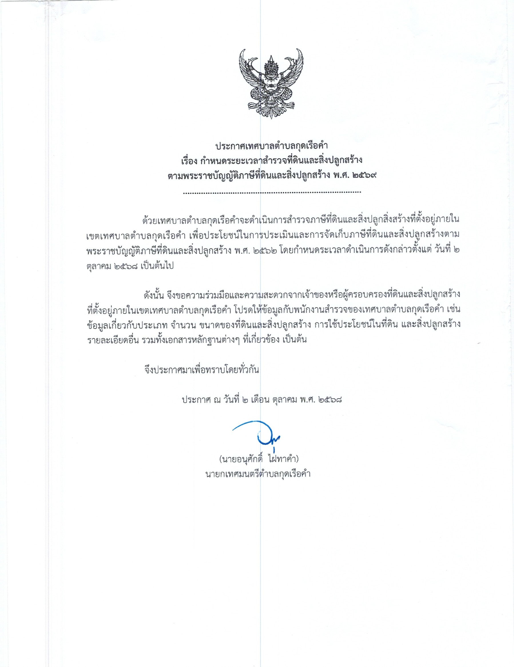 กำหนดระยะเวลาสำรวจที่ดินและสิ่งปลูกสร้างตามพระราชบัญญัติภาษีที่ดินและสิ่งปลูกสร้าง พ.ศ. ๒๕๖๙